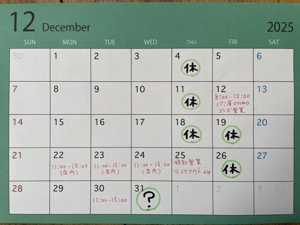 投稿日: 2025年11月29日 投稿者: littlebearscoffee12月ですね 2025年も終わりに近づいてきましたね。 12月カレンダーとなります。 31日まで一緒に駆け抜けましょう。 31日なにかやるかもです….